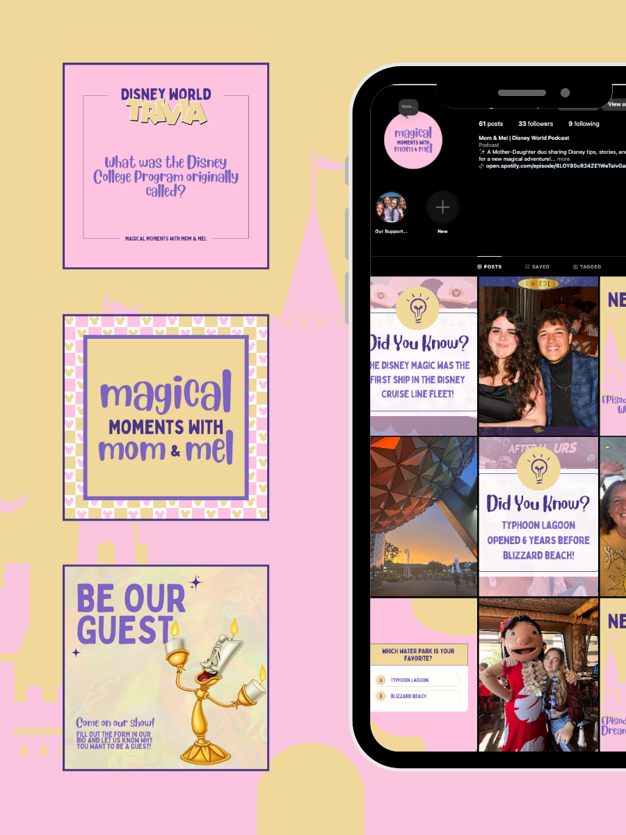 As the co-host and creator of Magical Moments with Mom and Mel, I developed the full visual identity and social media presence for the podcast. This includes designing the logo, creating the color palette, and crafting all Instagram posts to capture the podcastās whimsical and inviting vibe. Beyond design, I manage the podcastās social media, ensuring cohesive branding and consistent engagement across platforms.
